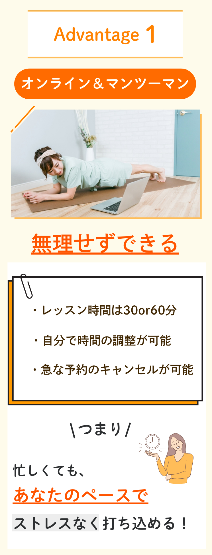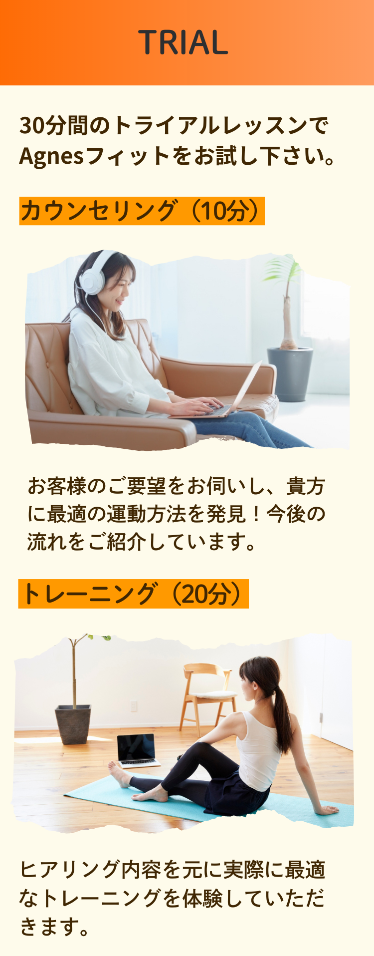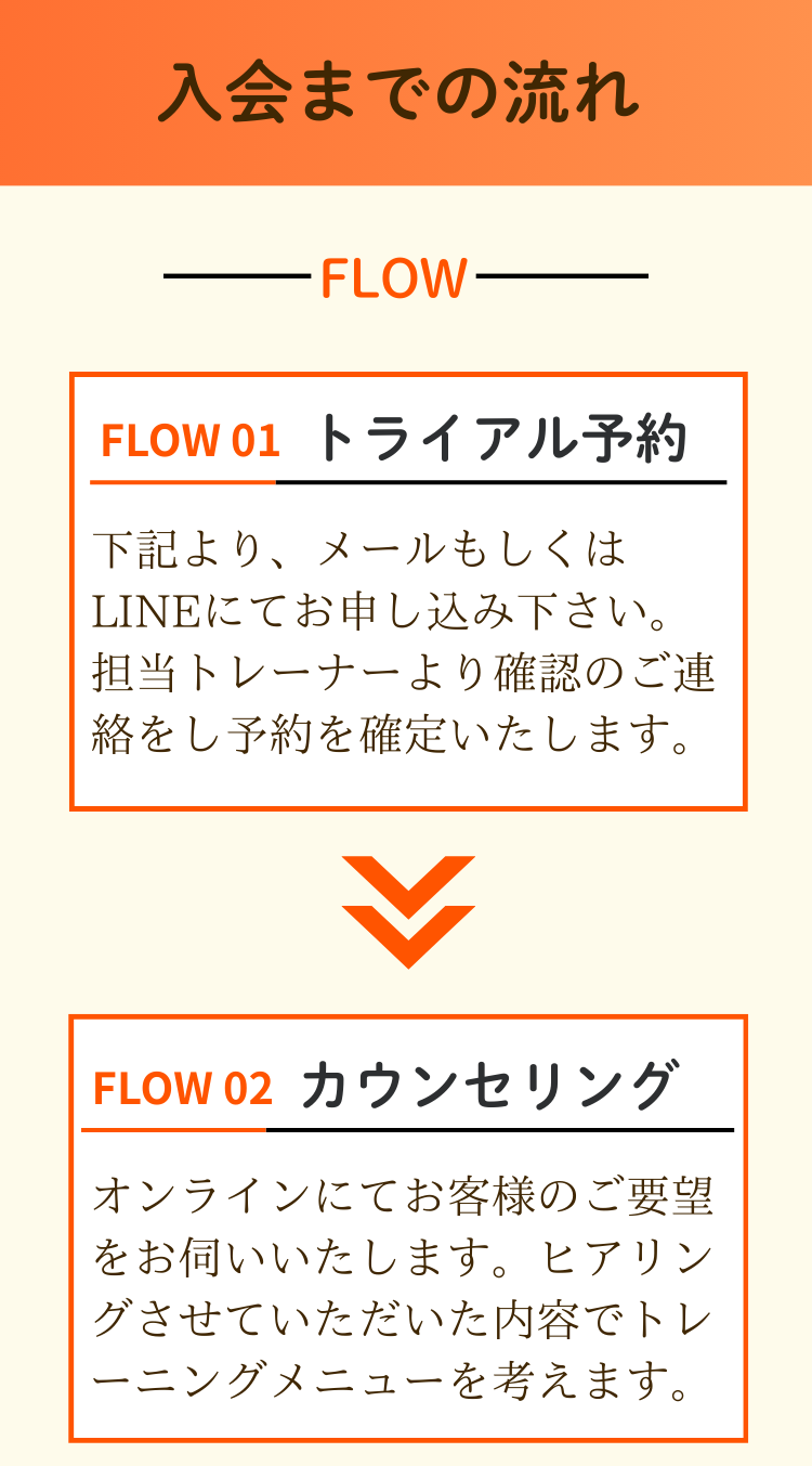 LINEで担当トレーナーと日時の調整をしていただき、オンラインレッスンを受けていただきます。